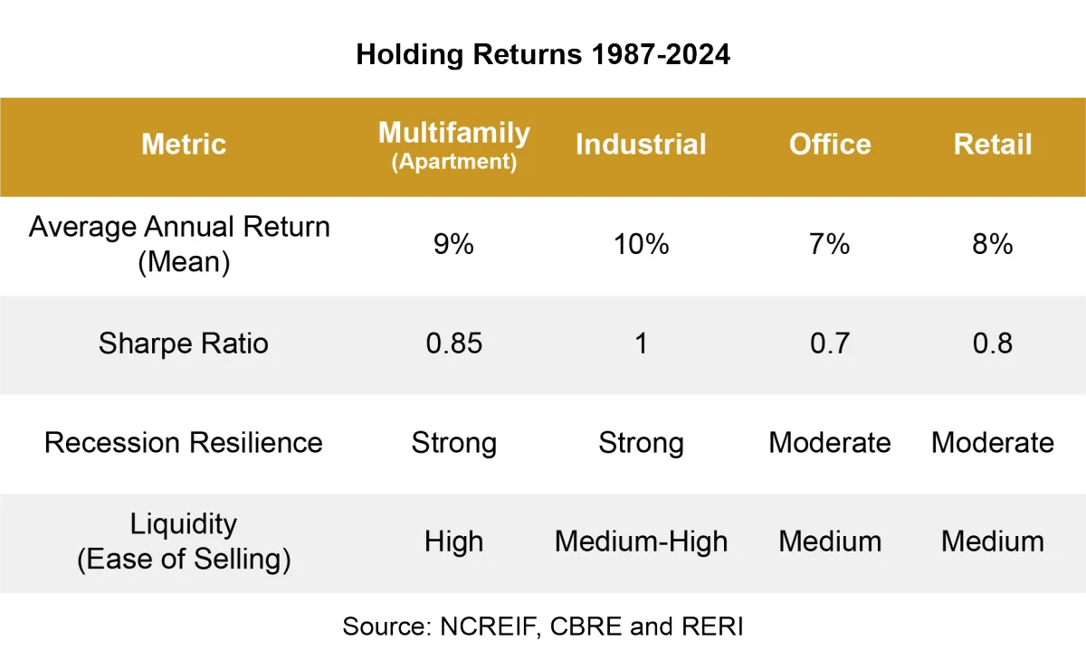 Investing in multifamily properties has consistently outperformed other real estate asset classes, delivering strong income returns and equity growth. According to NCREIF data, multifamily properties have historically provided an average annual return of 9.05% and a stable income return of 4.23%, surpassing office, retail, and industrial sectors.